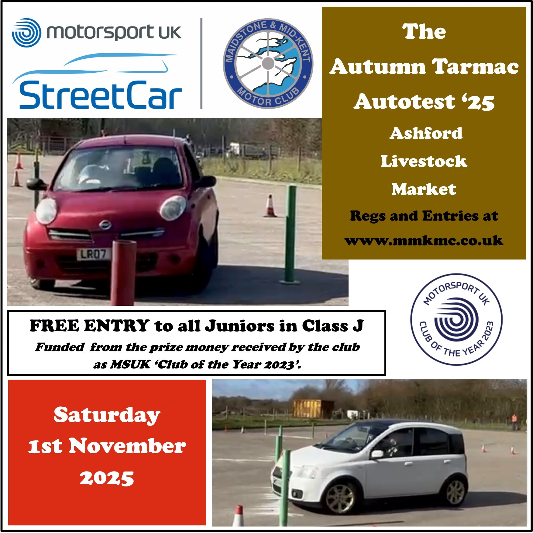 1st November @ Ashford Livestock Market Entries are now open for the MMKMC Autumn Tarmac Autotest being held on the 1st November at Ashford Livestock Market Entries can be made